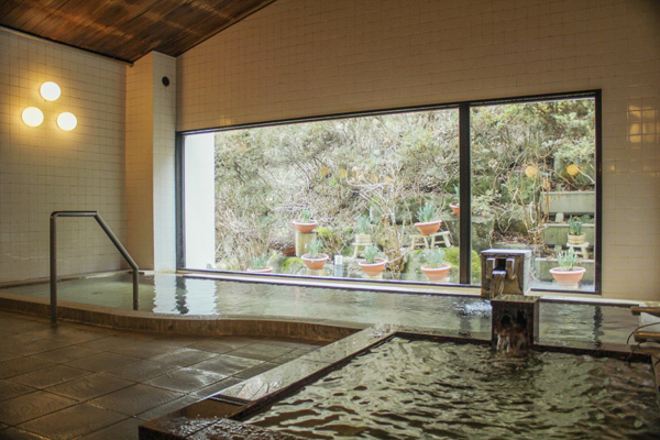 内風呂が1つだけの長方形の浴槽は8人程が入れる大きさとなり、大きな窓からは山の斜面が見える景観です。