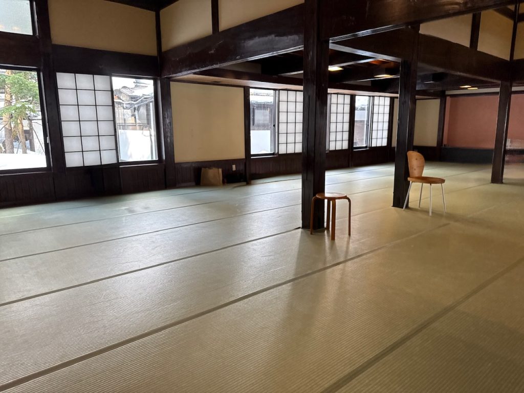 湯上りは吹き抜けの合掌造りの畳の休憩所で寝転びながらゆっくりできます。