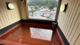 木製の浴槽の中央にはテーブルも設置されていて、飲み物を飲みながら足湯に入る事ができるようです。