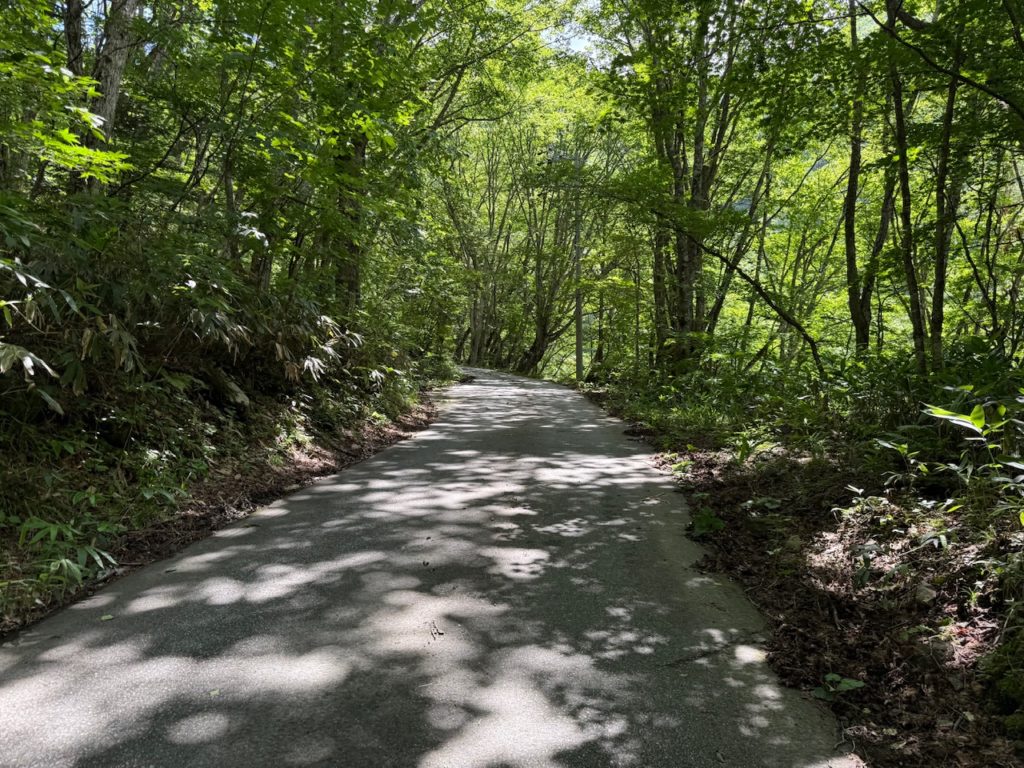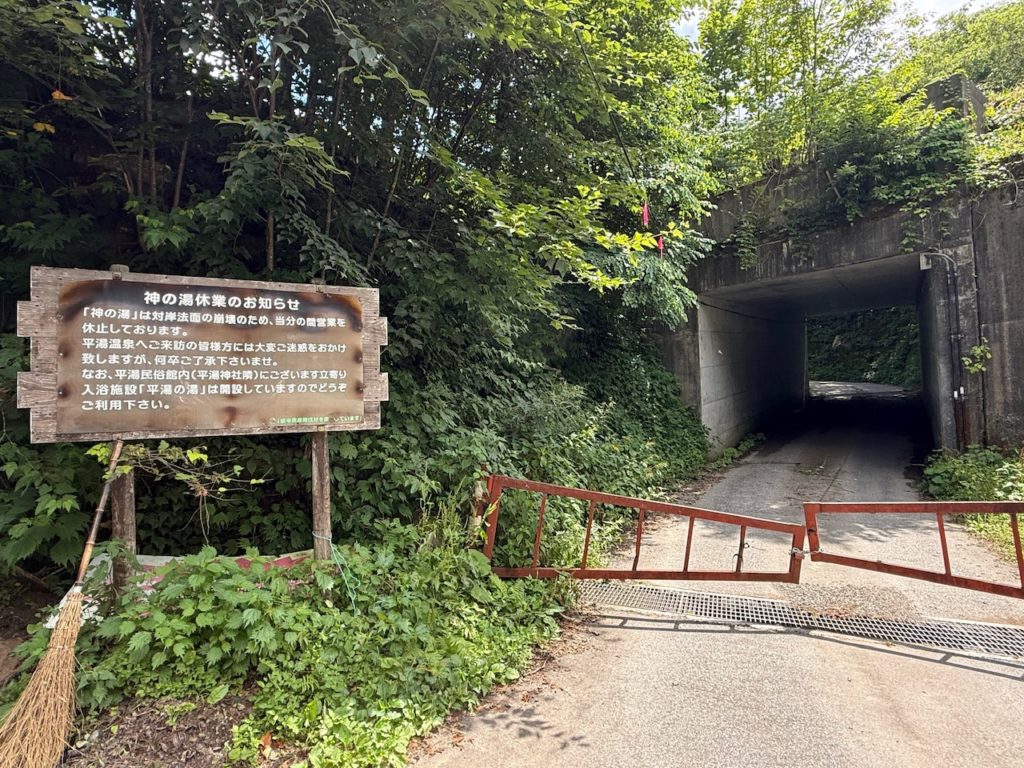 神の湯に続く車道は封鎖されていて車で入る事が出来ないようになっていました。