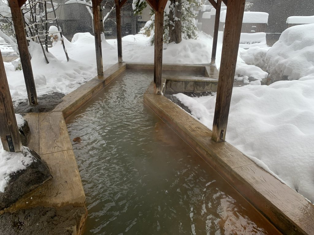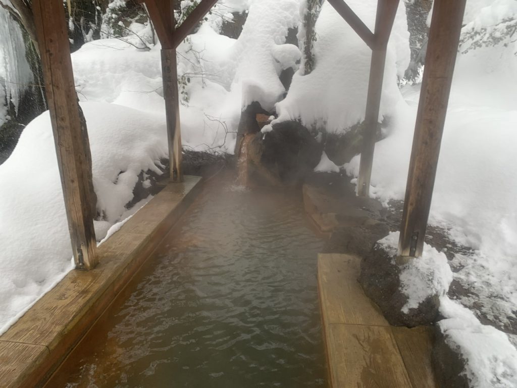 木造りの細長い浴槽には屋根が設置されているので、雨や雪でも入浴できます。