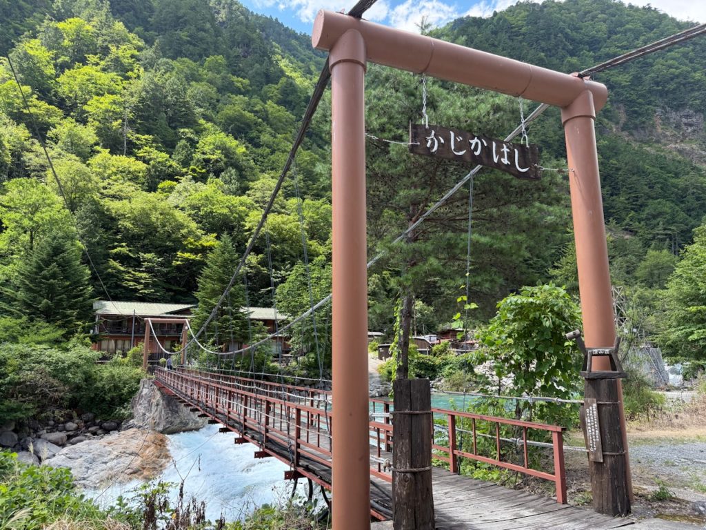 蒲田川に掛かる吊り橋の前に駐車場がありますので、駐車して橋を渡って旅館に向かいます。