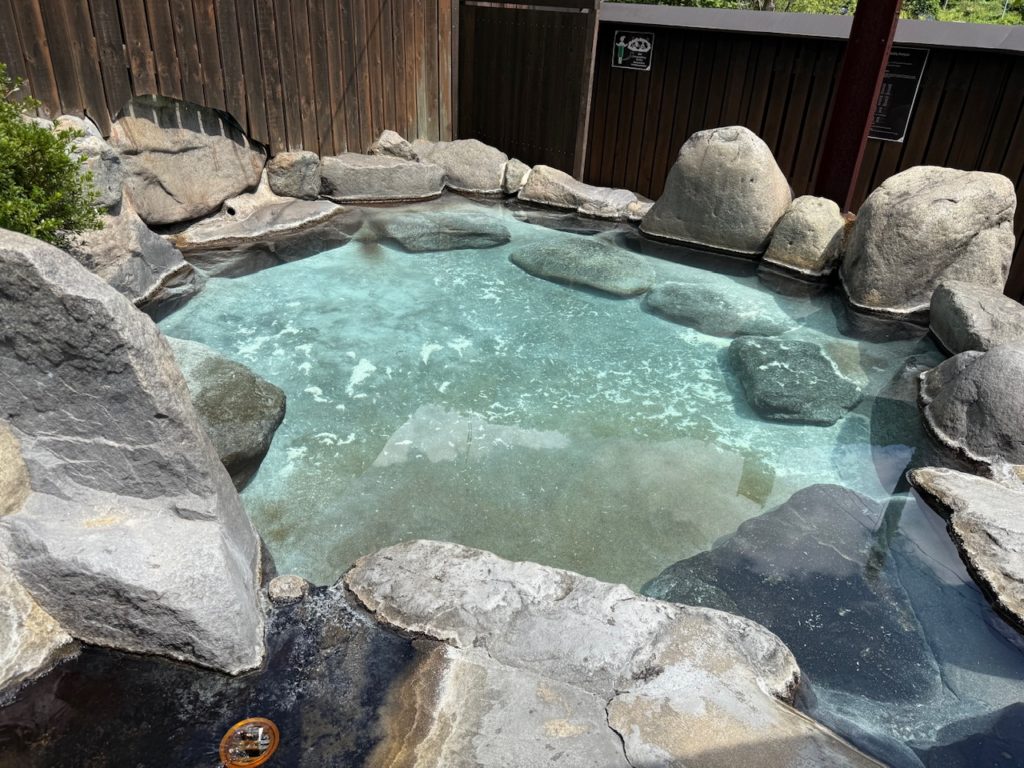 ブルーに輝く透明の温泉に白い湯の花がたくさん浮いていました。