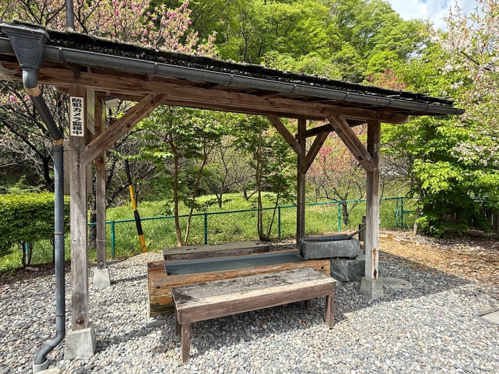 昼神温泉の中央を流れる阿智川沿いを一周する「せせらぎの散歩道」は、春は桜、秋にはイチョウの並木の中を散歩できるコースがあり、コースの途中、湯の瀬橋の脇にある新源泉・5号源泉の近くに湧き出た温泉をそのまま汲み上げて注いでいる足湯が源泉発掘記念として2007年に設置されました。