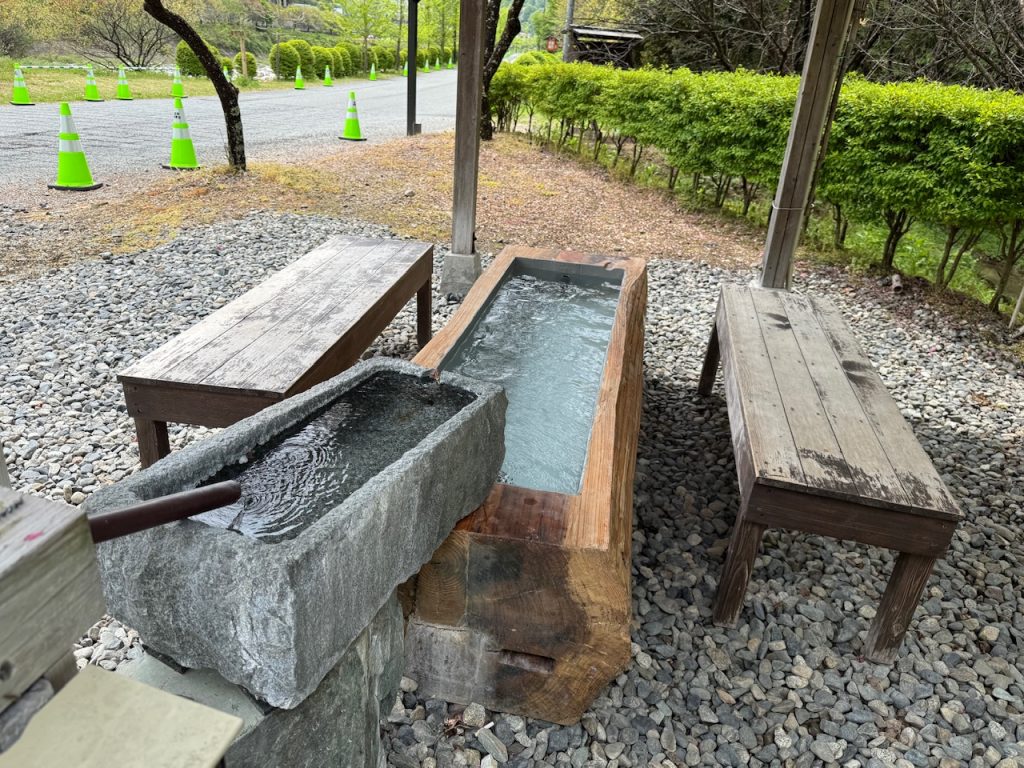 大木を切り抜いて作った浴槽の両側に椅子が設置されていて向き合って4人で足湯を楽しめる大きさです。