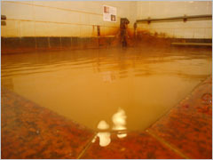 湯口の湯は透明ですが鉄分を含んでいるので、浴槽の湯は茶褐色で、濁りが強くて浴槽の底は見えない状況です。