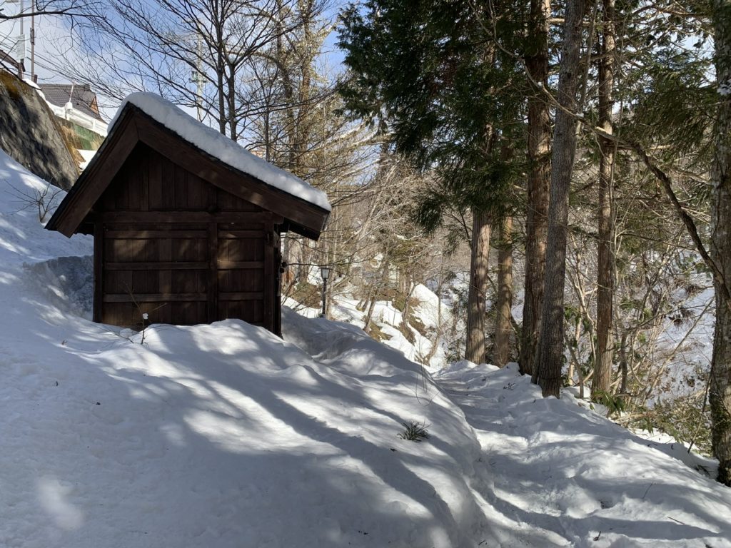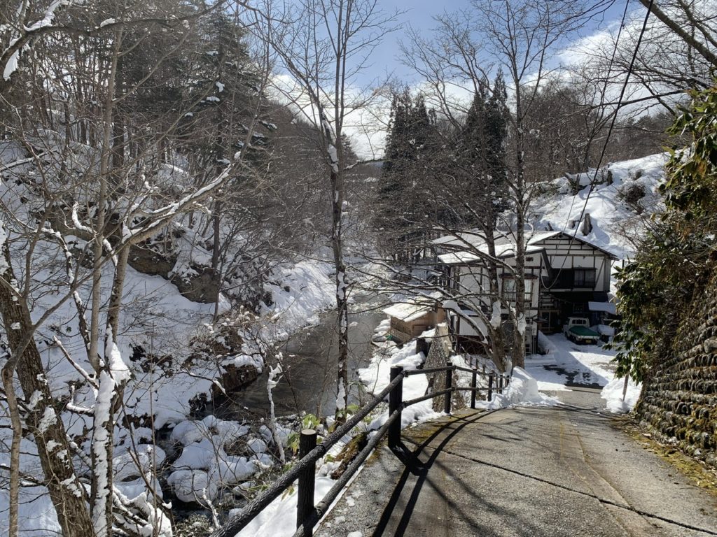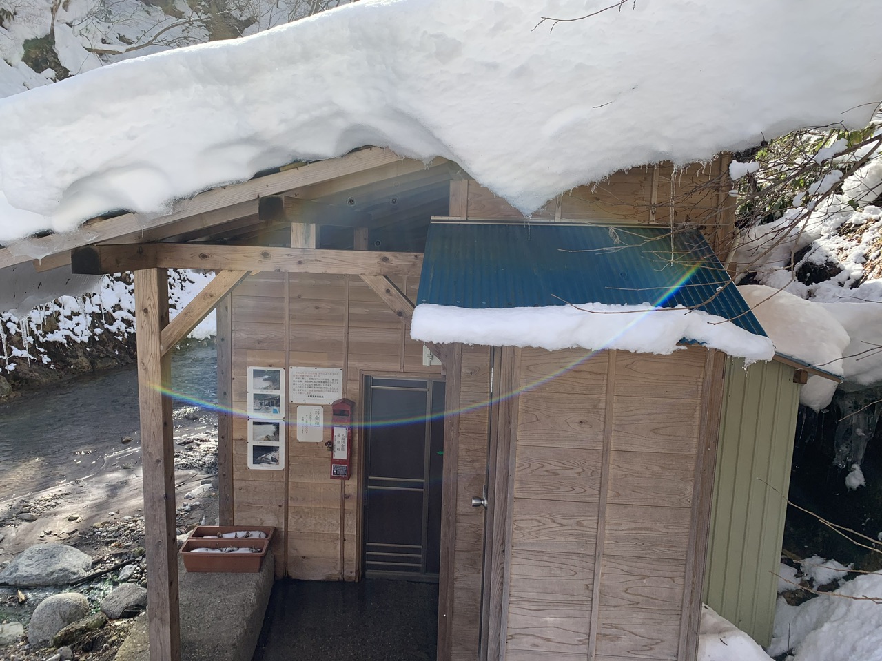 駐車場からすぐ近くの階段を降りると河岸の露天風呂に行けますが、急な階段の為、行きが積もってますので、危ない為閉鎖されていました。