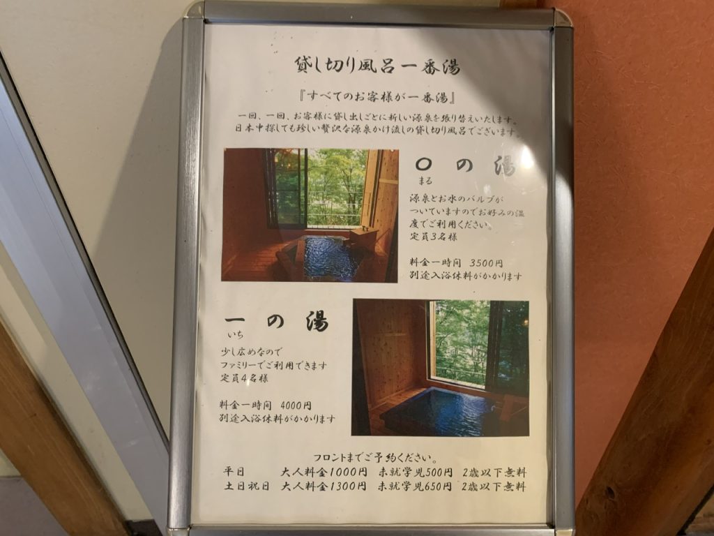 - 日帰り温泉料金:平日1000円 土日祝日特別日1300円(2024年現在)