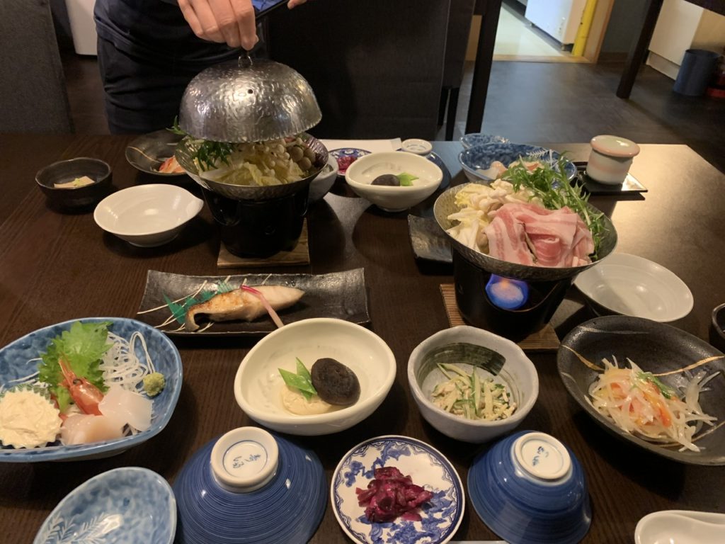 和食の夕食で鍋、刺身、天ぷらなど種類もたくさんありどれもおいしく豪華でした。