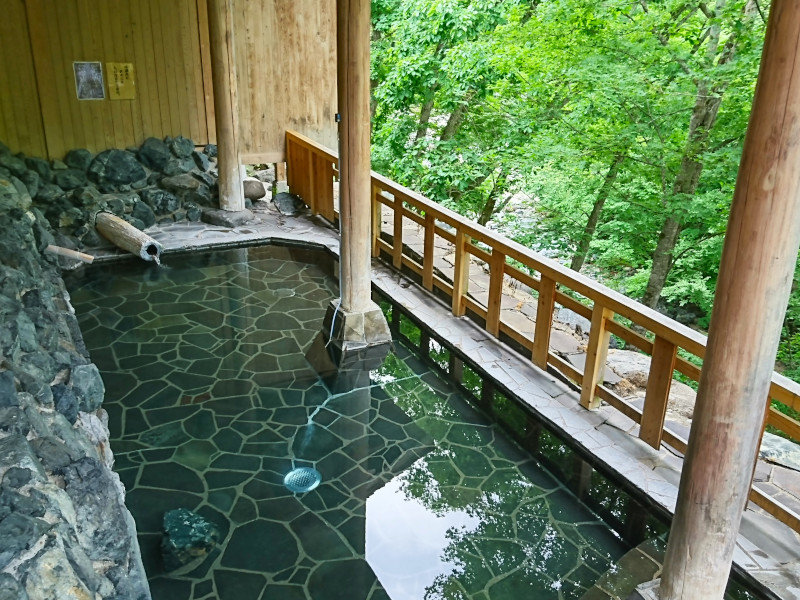 舟岐川に面した高台にあるこちらの日帰り温泉施設は、専用の源泉である単純硫黄泉を掛け流しで提供しており、露天風呂から眺めるブナの森と舟岐川の風情は格別です。