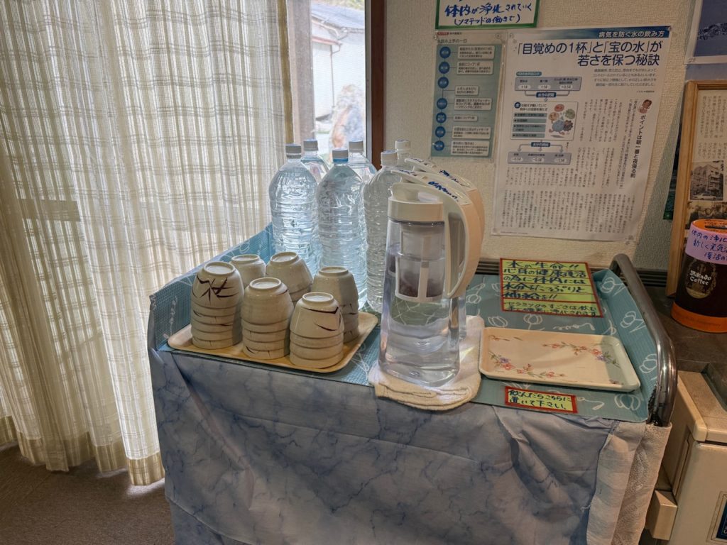 ロビーから大浴場に向かう通路に水が用意されていますので、入浴前、入浴後に体を潤すことができます。