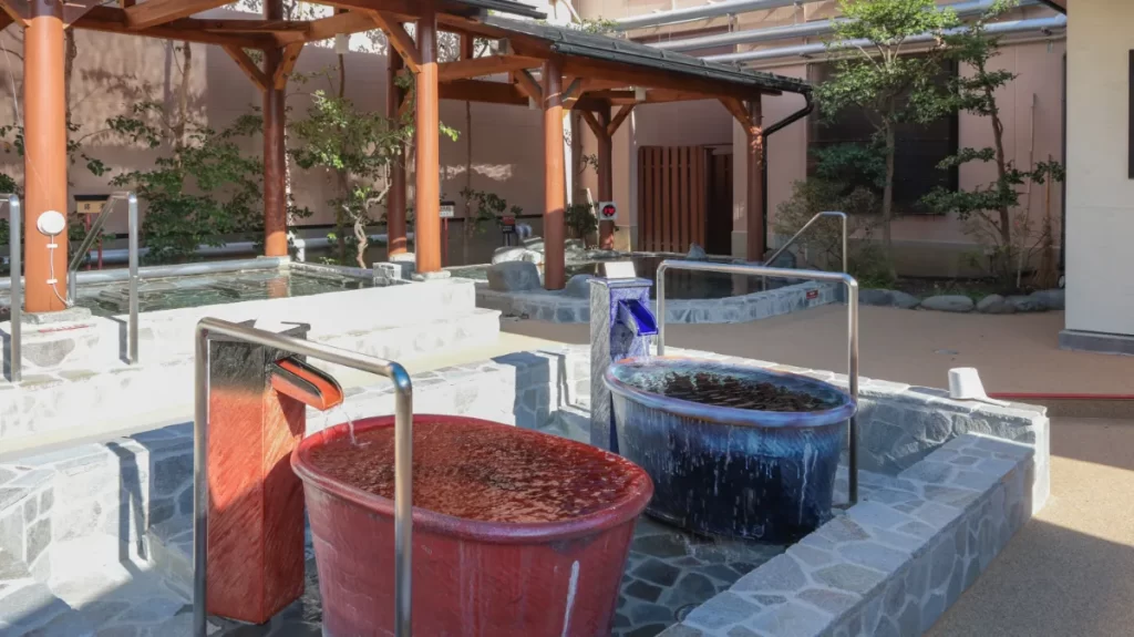 松本インターチェンジにほど近いショッピングセンター内の一角にある日帰り温泉施設は、千曲市上山田温泉に本館を構え、上山田温泉より直送した純天然源泉の岩風呂をはじめ、男性、女性の大浴場で異なるコンセプトの多様な種類のお風呂を揃えています。