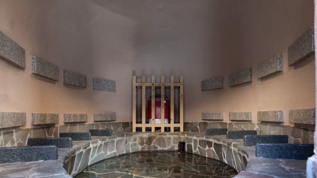 入口が低く洞窟に入っていくような低温サウナは足元がお湯で満たされた薄暗い空間で雰囲気がありました。