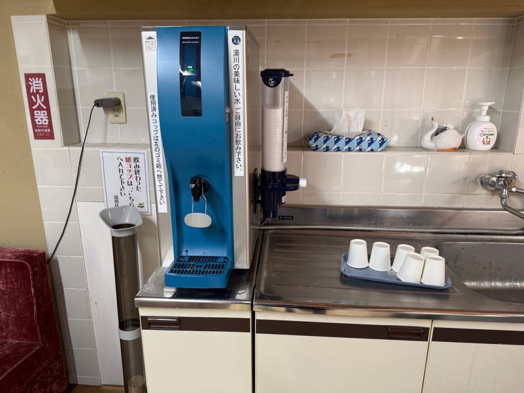 休憩所の端に湯川のおいしい水を飲むことができる水飲み機がありました。