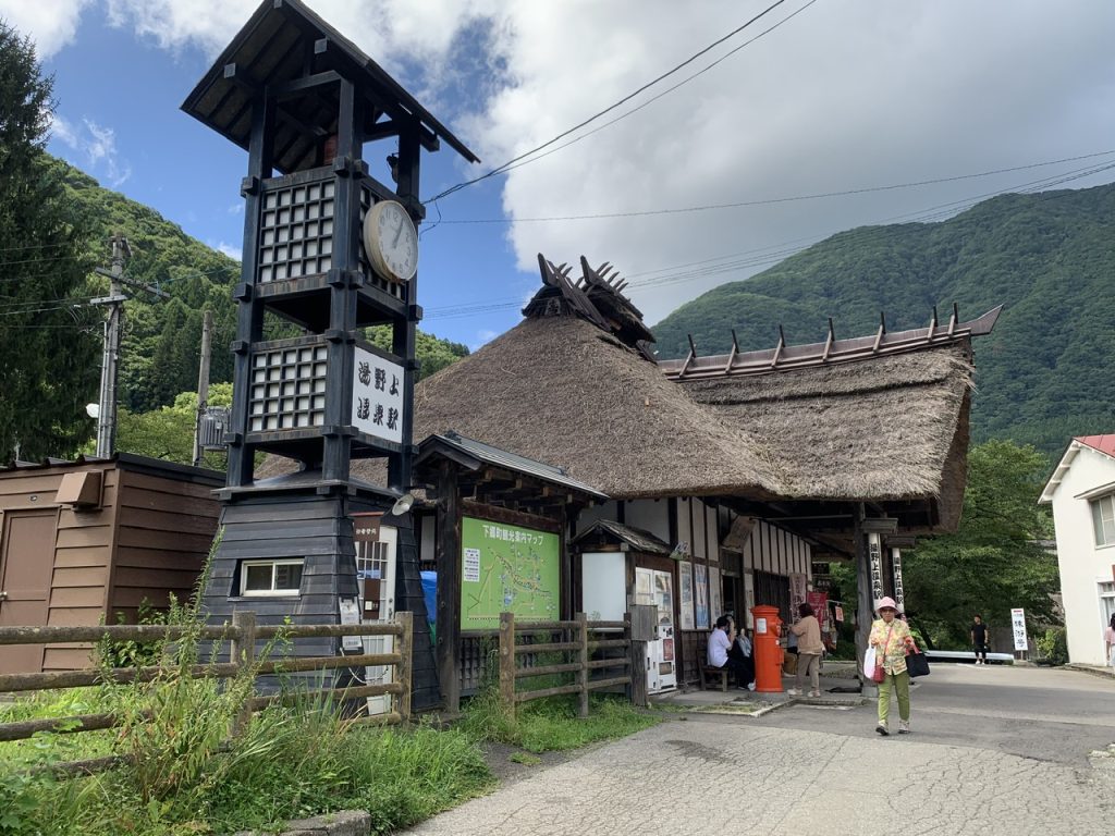 昭和7年に開業した湯野上温泉駅は、日本で唯一の茅葺屋根の駅舎を有しており、駅の南側には約30軒の温泉宿が並ぶ温泉街が広がり、湯量が豊富な60℃の高めの源泉を5つ持っています。
