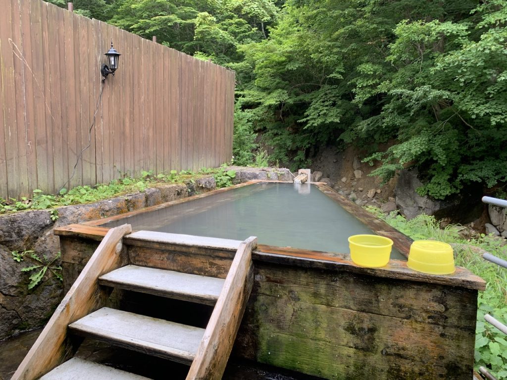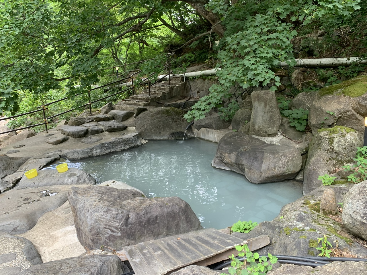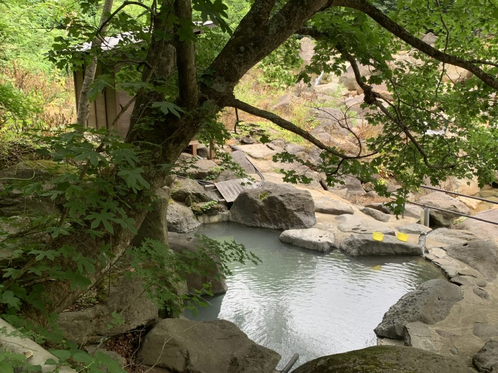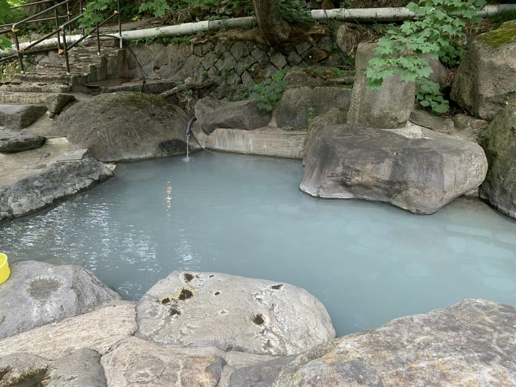 露天風呂は青白く濁る湯はしっとりしていて気持ちがいいです。