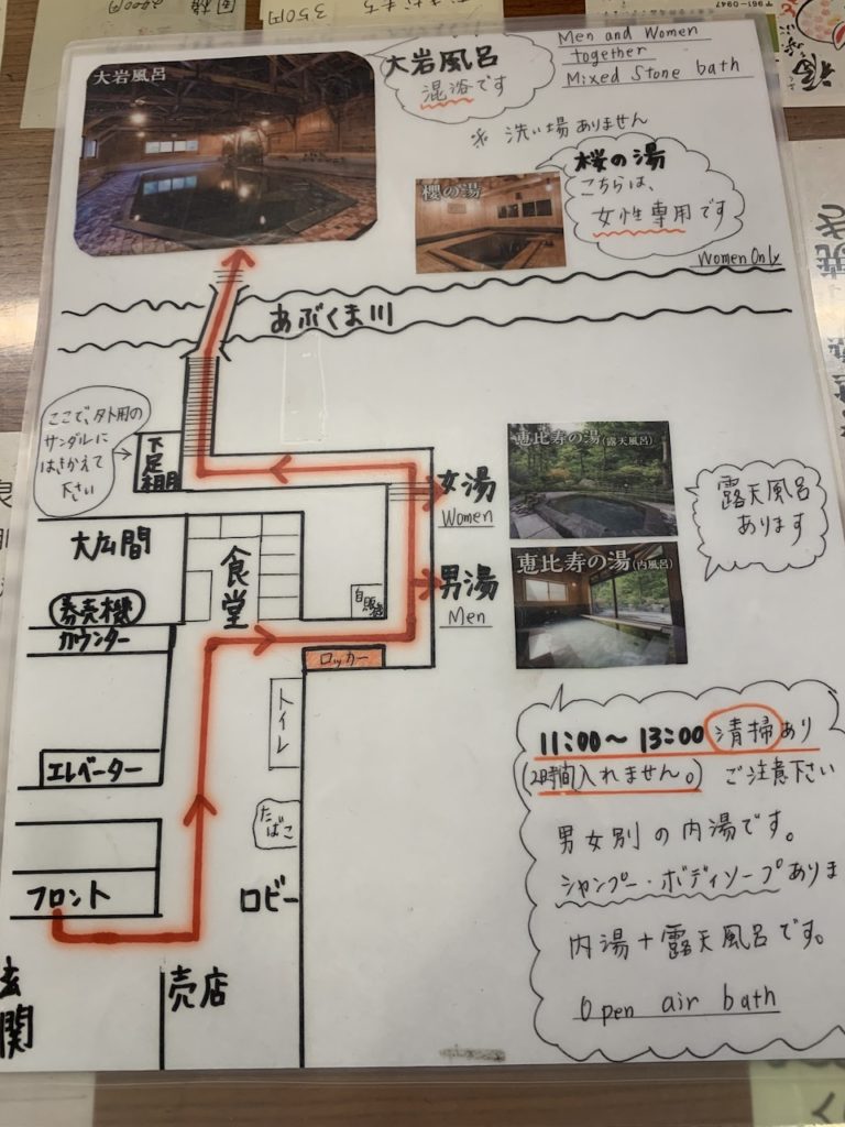 内風呂や露天風呂など複数のお風呂がありますので、案内図を見ながら館内を散策してみます。