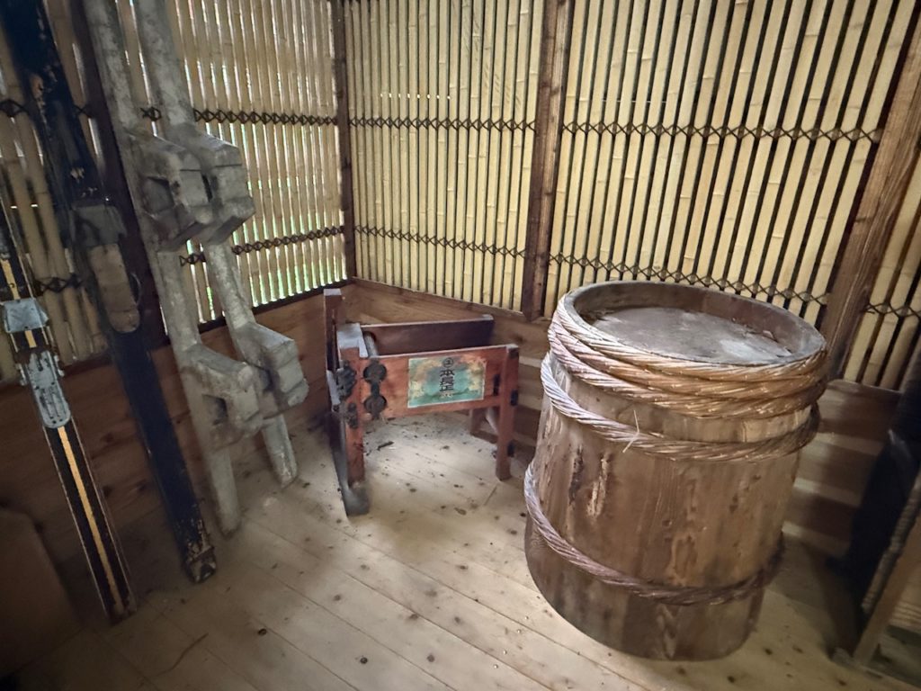 外に出る扉があるので開けてみたところ、露天風呂ではなく、古めかしい工具が置いてありました。