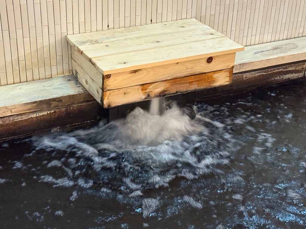 湯口からドバドバと湯が流されていますが、浴槽からお湯はオーバーフローしていませんので、お湯は循環していると思います。