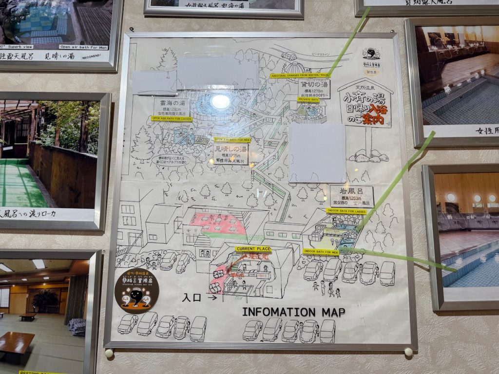 お風呂はそれぞれ離れているので案内図を見ながら確認しつつ、最初は大浴場に行ってみます。