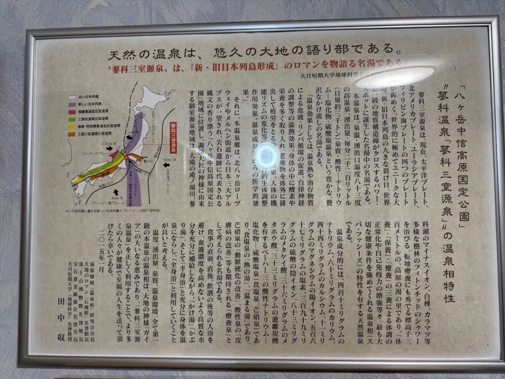 蓼科温泉の源泉は蓼科三室源泉とのことで説明の掲示もありました。