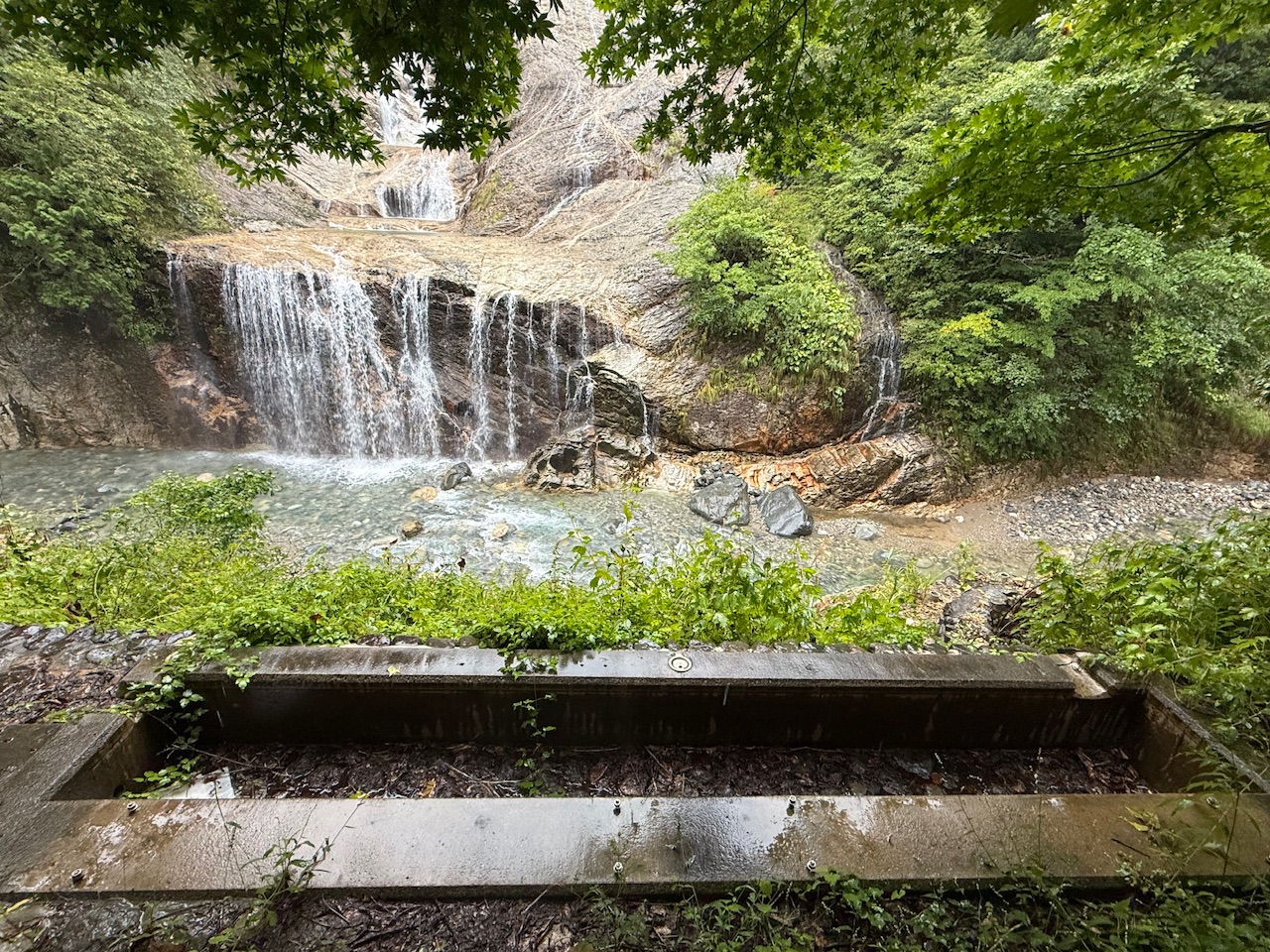 滝を見ながらここでのんびりと足湯をしたら気持ちがいいんでしょうね。
