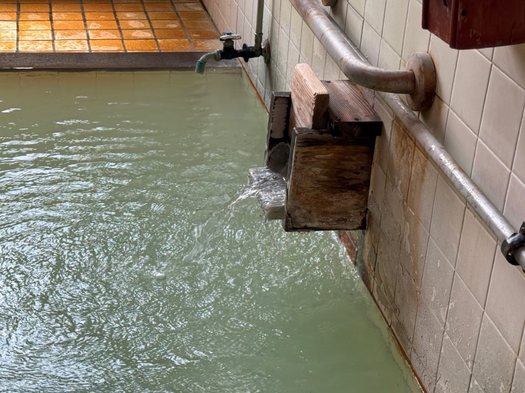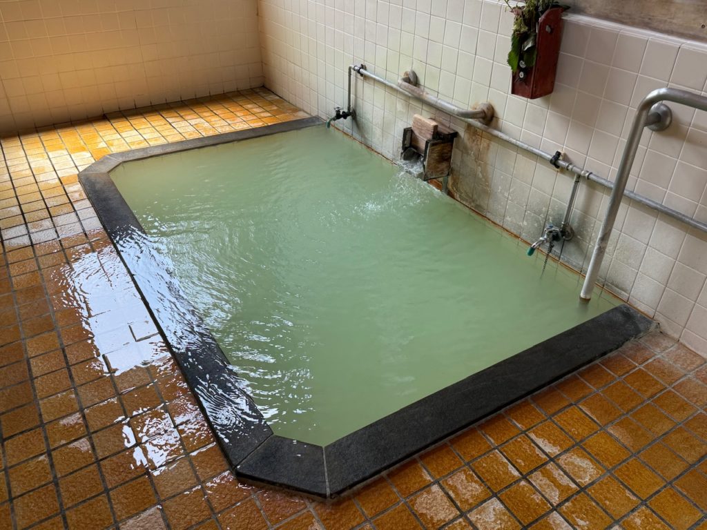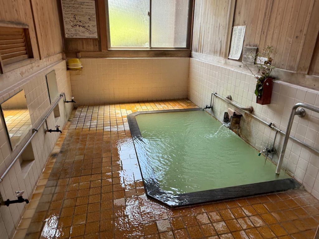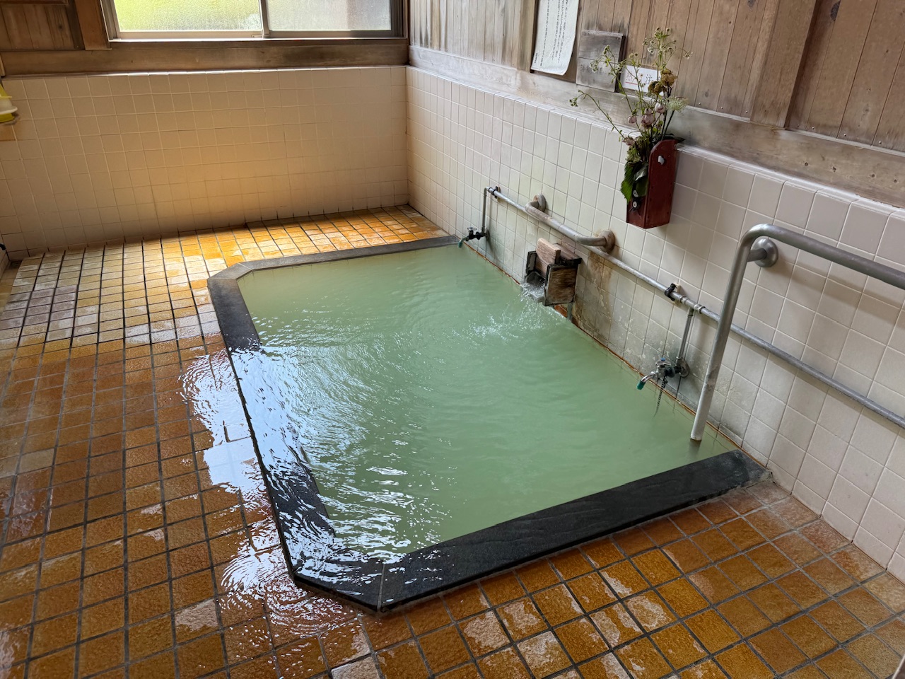 内風呂は長方形の浴槽1つとなり、白く緑色に濁ったお湯には湯の花が浮いています。