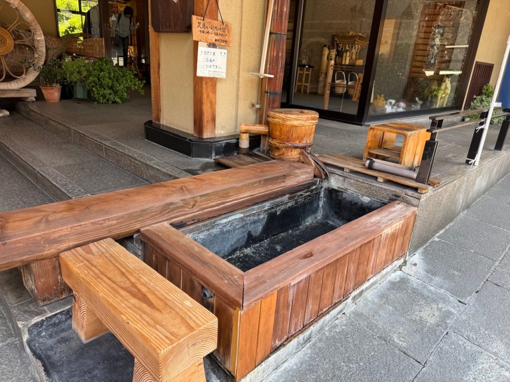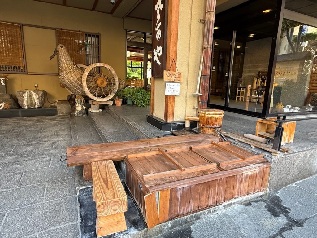 温泉街中心地にあり、老舗旅館の雰囲気が漂う建物の玄関前に足湯が設置されていました。