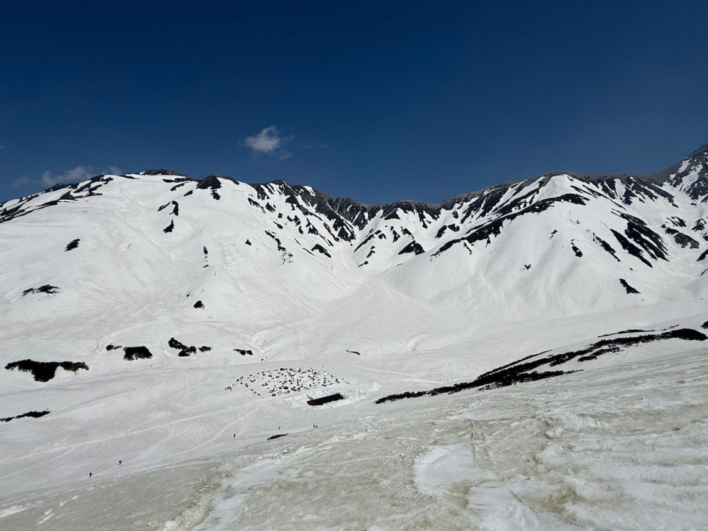 持参したアイゼンを装着して坂を下りていくと雷鳥沢のキャンプ場でテントを張っている人たちが見えてきました。