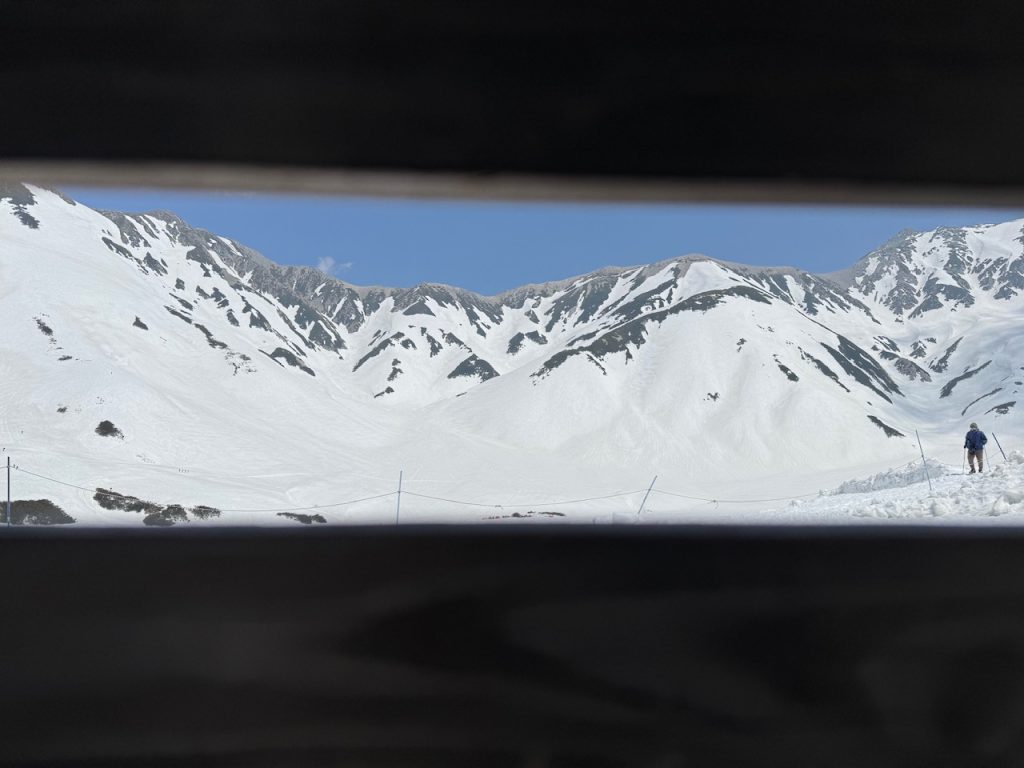 室堂から圧雪された雪道を歩いてみくりが池を通り過ぎ、地獄谷を見ながら進んで行くと雷鳥荘に到着します。