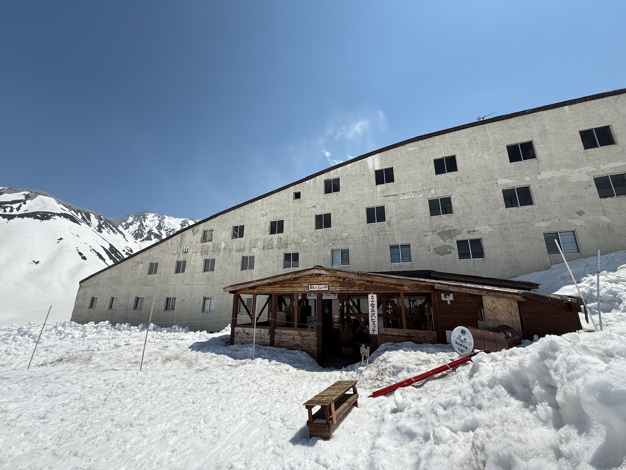 標高2277mにある雷鳥沢キャンプ場を眼下に見る位置に、山の斜面と一体となってカーブを描いたようなコンクリートの建物は、厳しい自然環境でも耐えられるように設計されています。