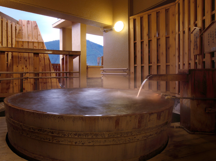 露天風呂は2つあり、4人位の大きさの石の浴槽とヒノキの丸い浴槽がありました。