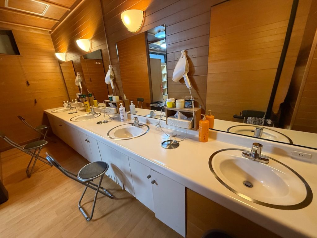 ボディーソープとリンスインシャンプーが備え付けられており、それとは別に浴室入口に好きなメーカーのシャンプーを選んで使えるようになっていました。