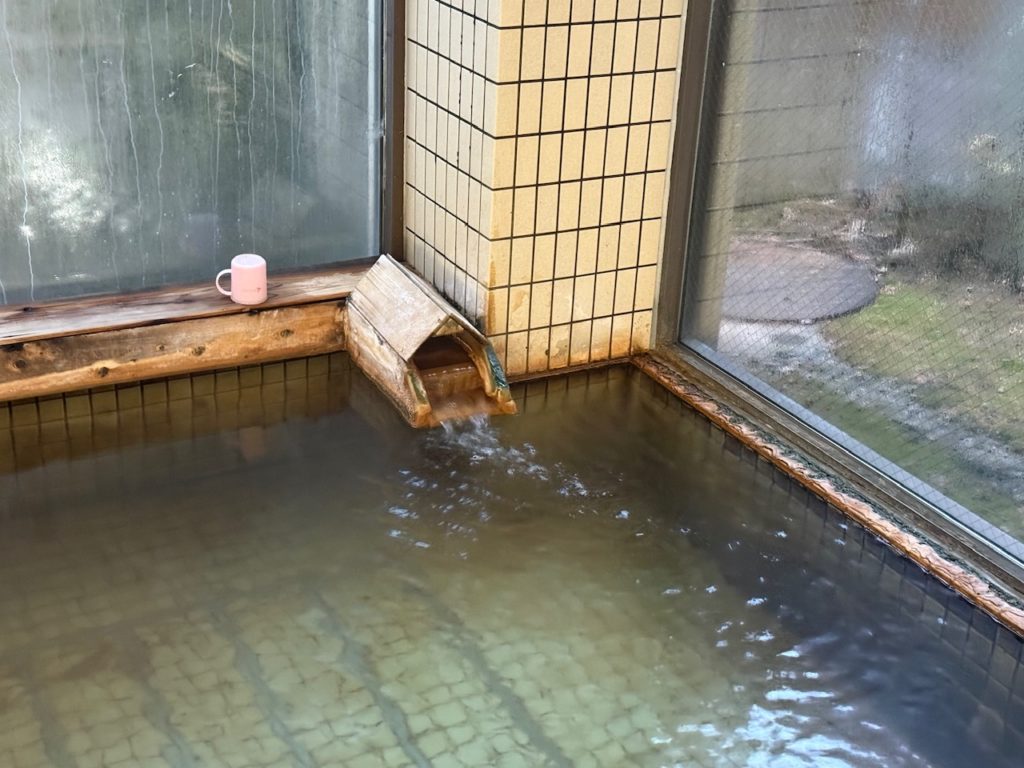 100%天然の温泉は源泉掛け流しで浴槽から湯がオーバーフローしていて茶色の湯の花が浮いています。