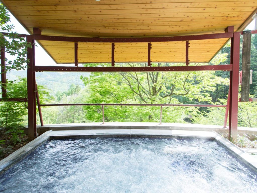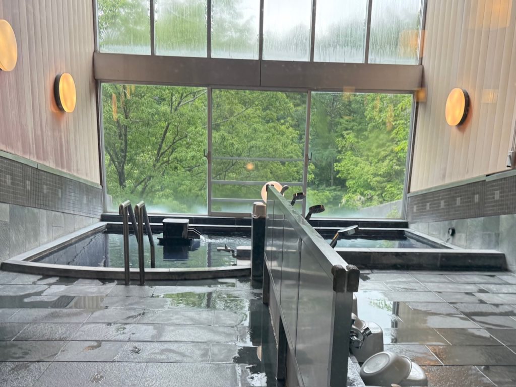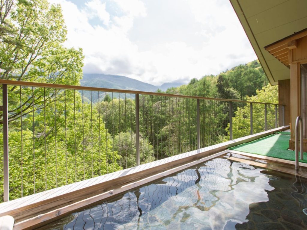 中房渓谷から引湯した温泉は、北アルプスを臨む展望露天風呂「石づくりの大浴場」と「ひのきの大浴場」があり、朝と夜で男女交替制となっています。