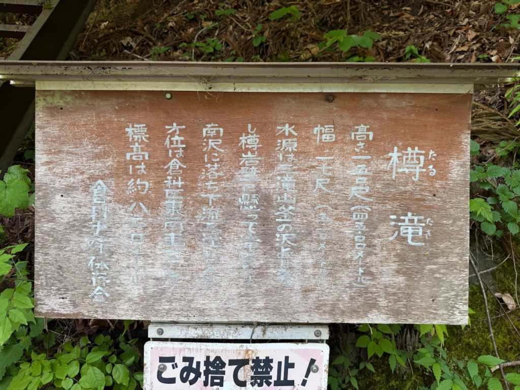 樽滝の案内板が掲示されていて、鉄の階段の横に水が流れていましたが、滝と言える程の流れではないので、階段を上って先に行ってみます。