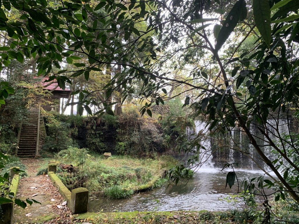 神社から階段を下った静かな木々が広がる場所に不動の滝があります。