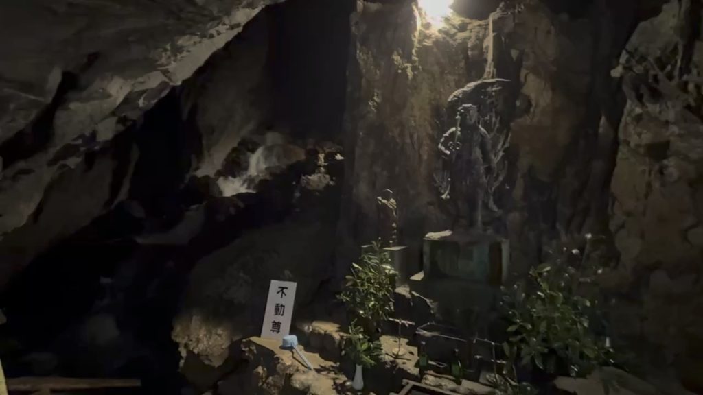 曲がりくねった階段を下りていくと、水の音が聞こえてきて、不動明王の像が守る大きな鍾乳洞の広場に出ました。