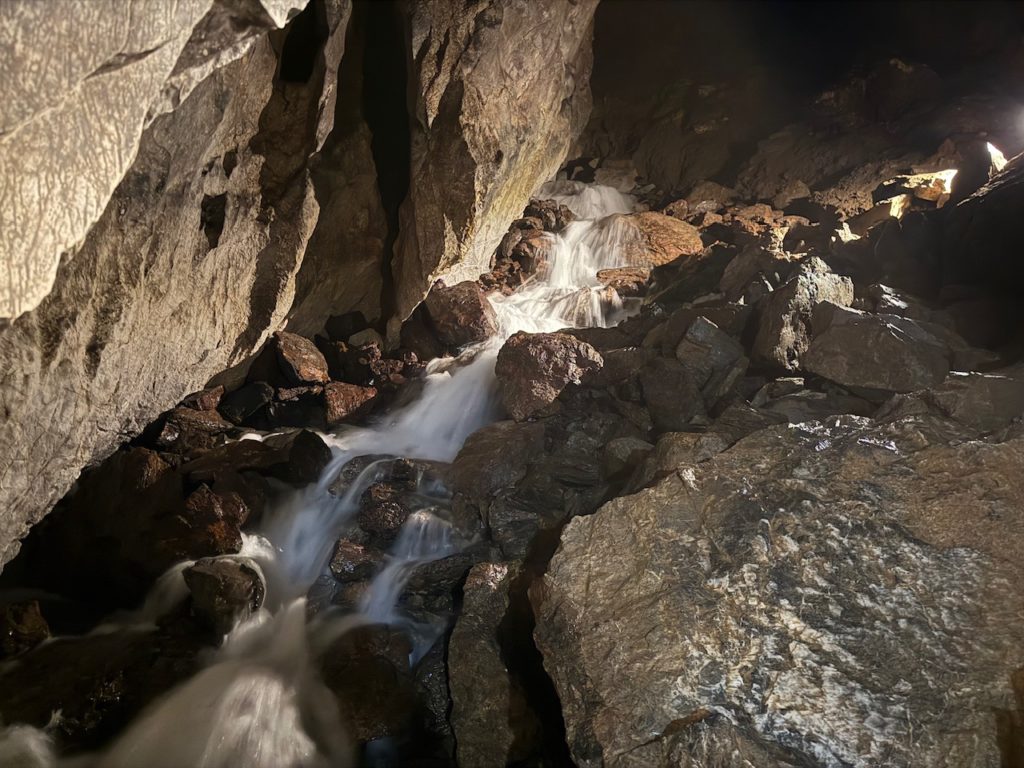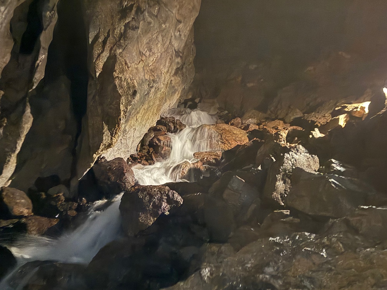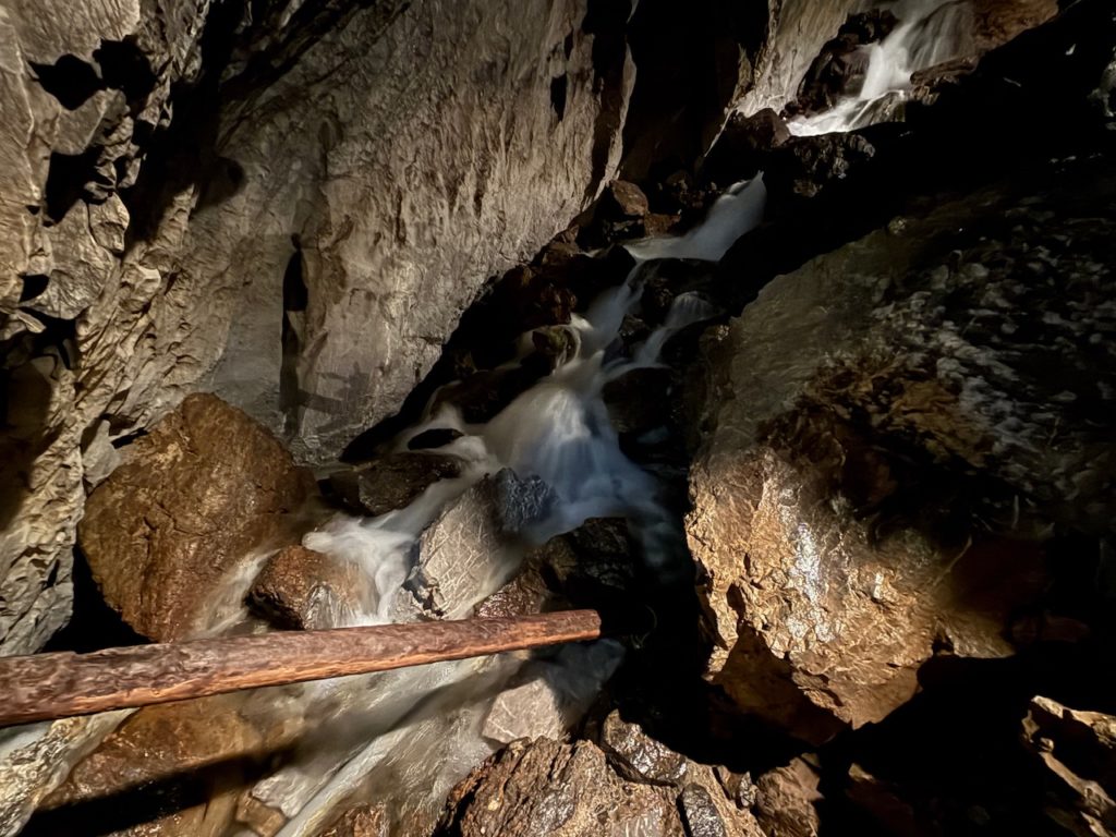 洞窟内に水の轟音が響き渡って暗闇の先から水が流れてきていました。