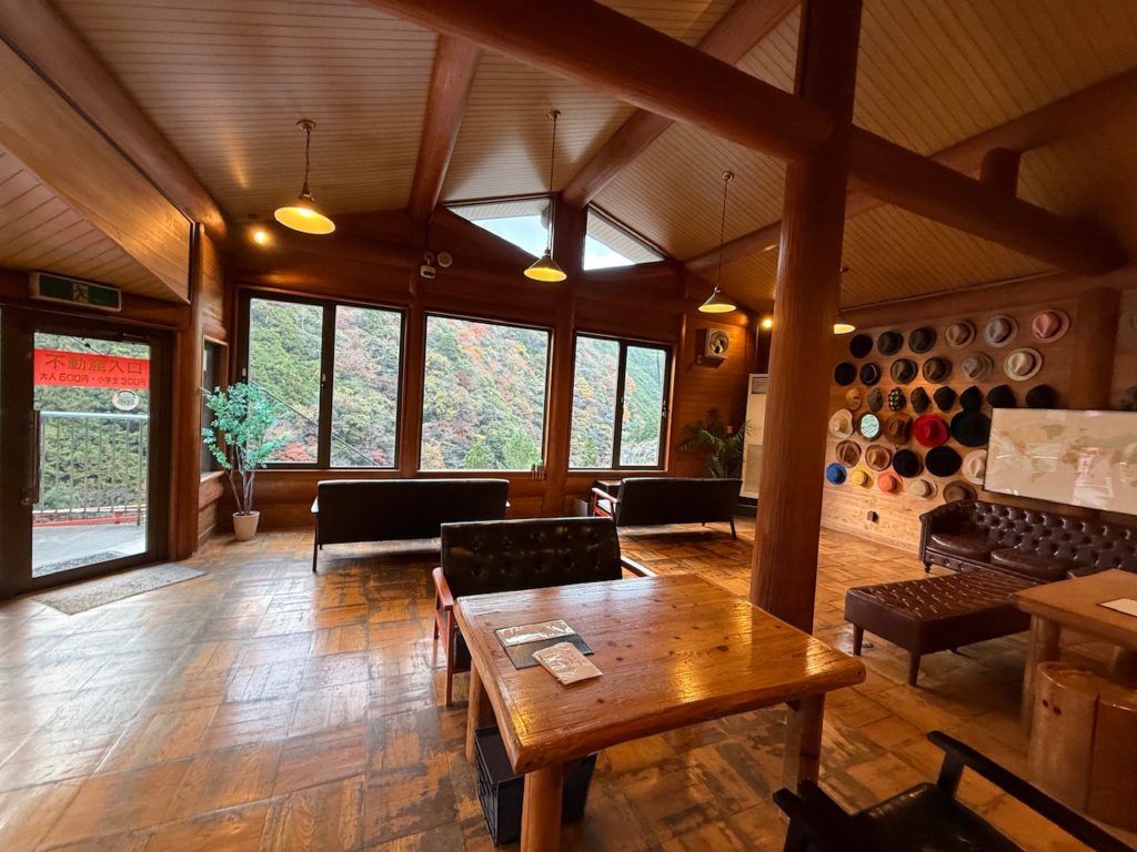 受付に戻ると「喫茶 ホラ!あな」で、冷たい水とハーブの水を無料で頂けるとのことで、ソファに座ってハーブ水を飲みながら大きな窓から見える渓谷の紅葉の景色を眺めながらゆっくり休憩ができました。