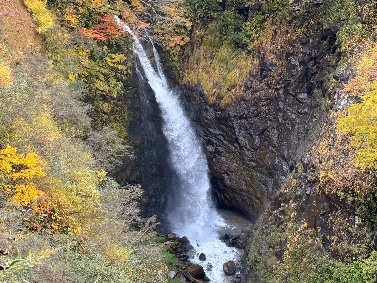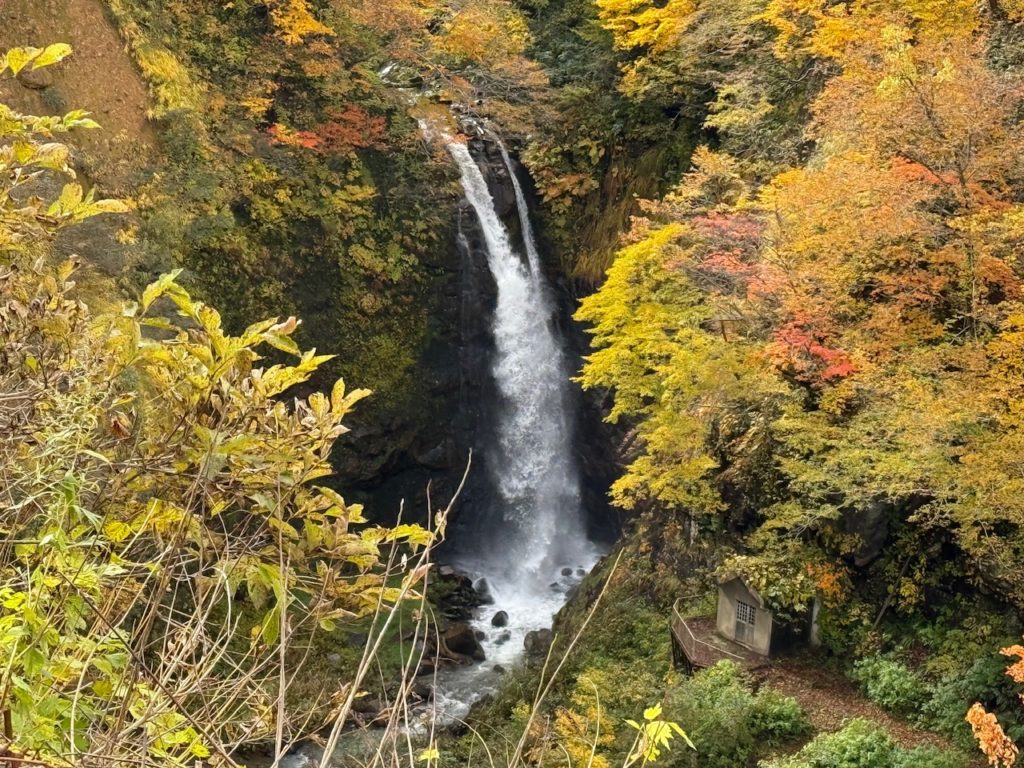 車道から見下ろす位置に不動滝が流れていて紅葉の中に輝く白い滝が美しいです。