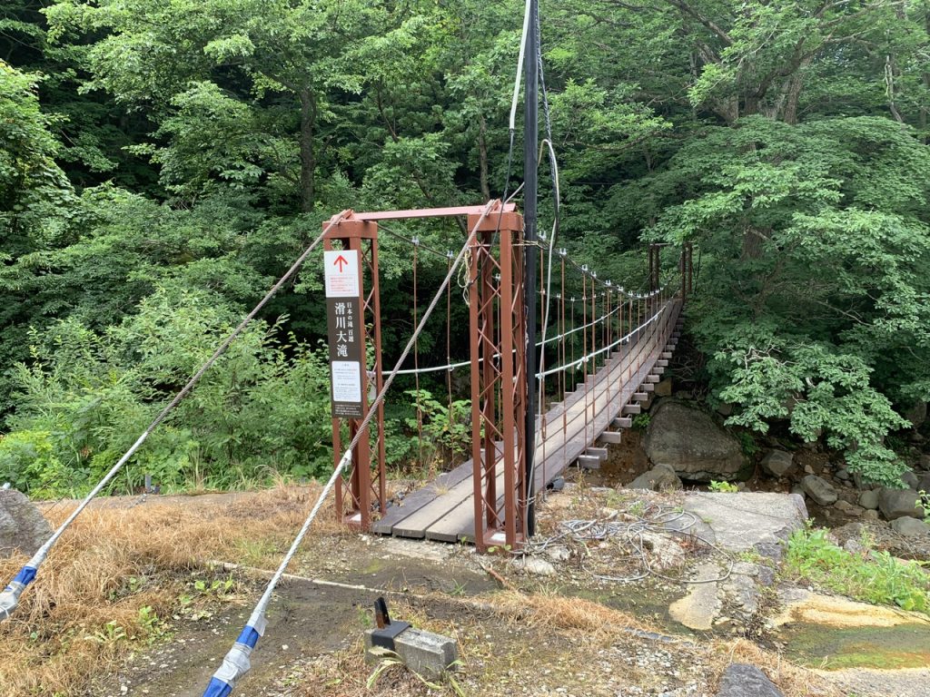 滑川温泉の福島屋さんに行き、通行料200円をお支払いして、敷地内の橋を渡って登山道を登っていきます。