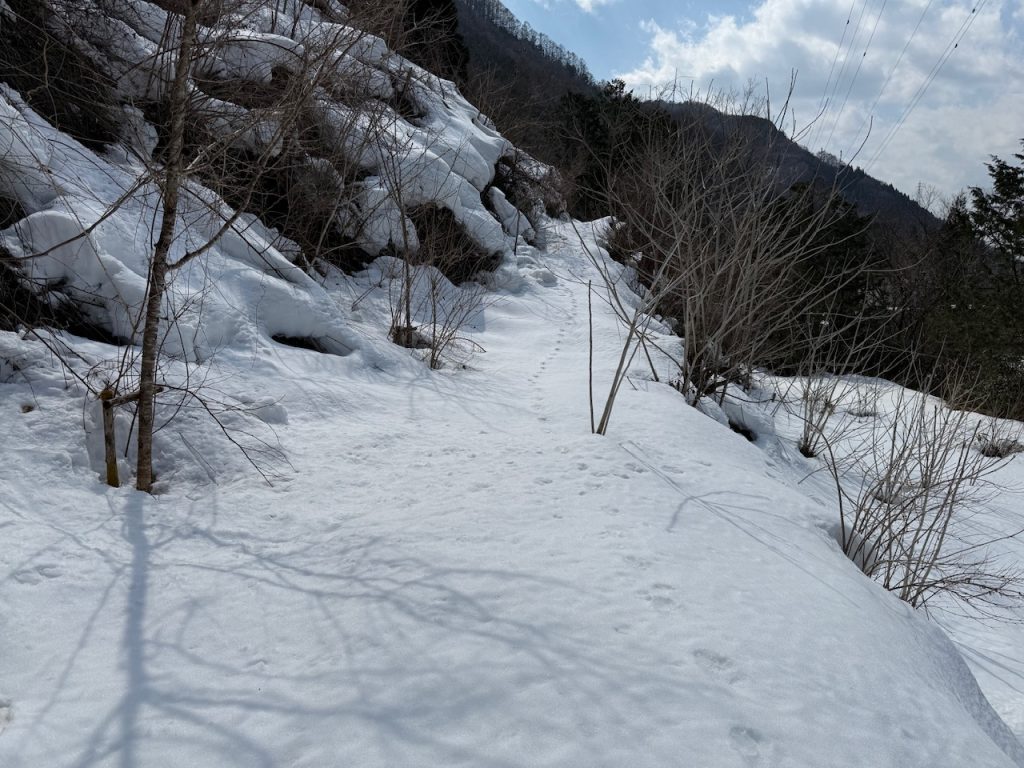 遊歩道と思われる道がありますが、まだ雪も残っていて、誰も歩いた形跡がないため少し躊躇しましたが進んでみました。