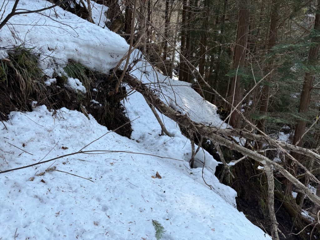 雪は固まっていたので進めましたが、2分ほどすると倒木が見えてきました。