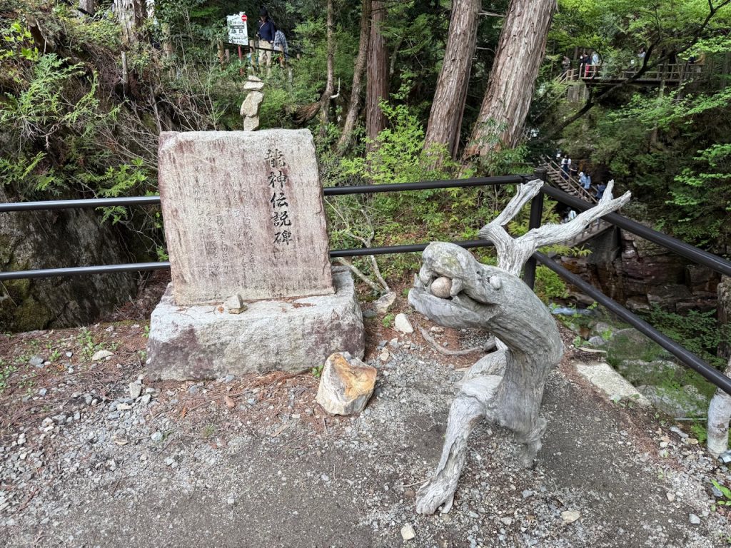橋の前には龍の伝説の石碑が置かれ木で作られた龍もいました。