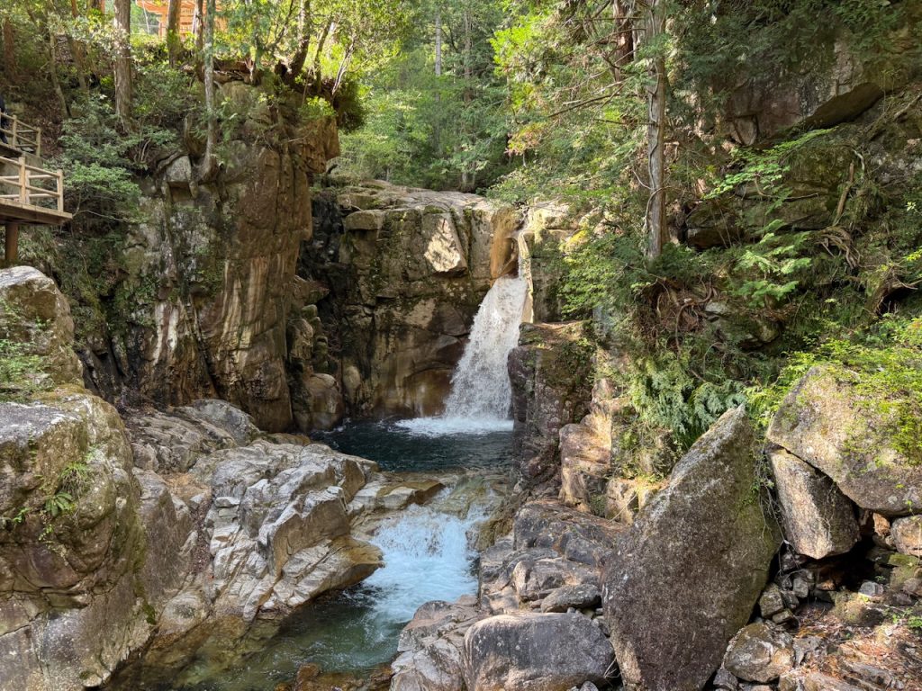 川上川の最下流に位置する落差12mの「竜神の滝」は、陽の当たり方によって1日に7回色が変わる美しい滝壺を間近に見られる歩道も整備されています。