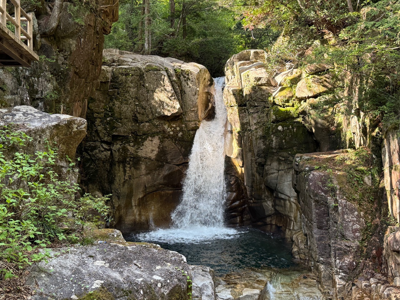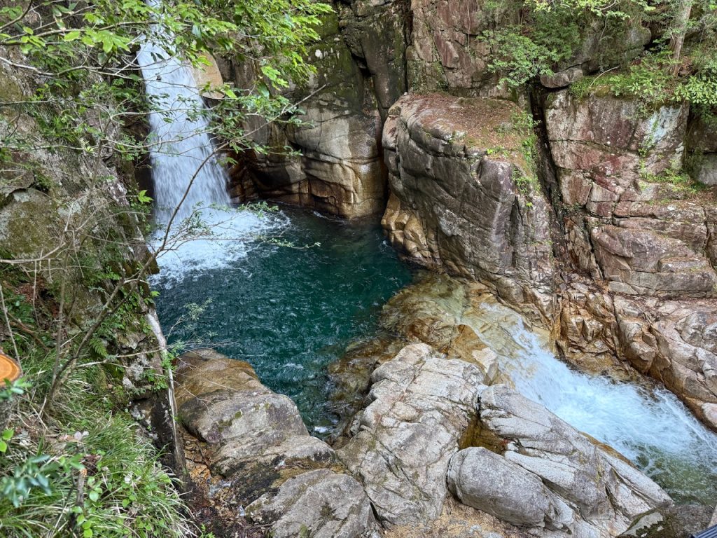 青みを帯びたグリーンの滝壺は透明度があり、深そうで引き込まれそうになる神秘的な美しさです。