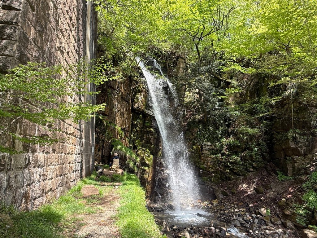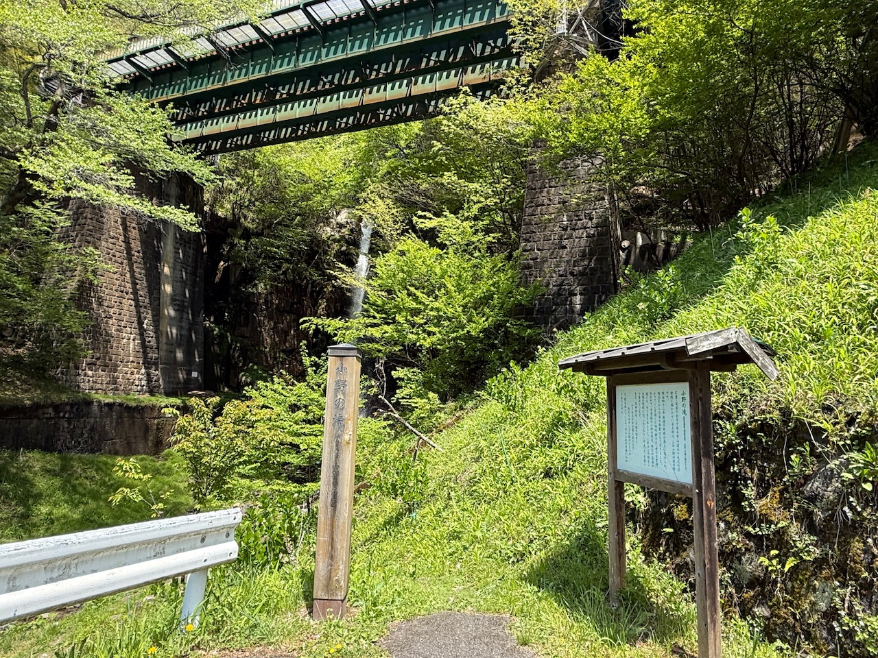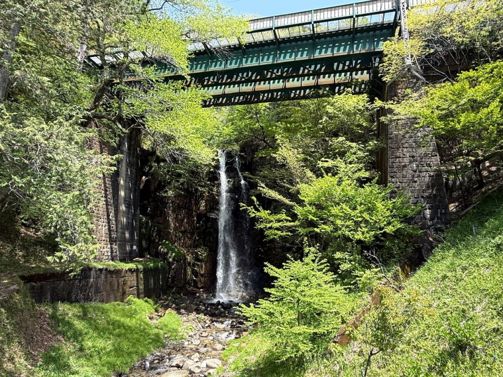 水が流れ落ちる上部には鉄道の鉄橋が架かっているので、自然の中の滝ではないですが、鉄橋の石済みがレトロな雰囲気をだしていて自然と近代が合わさった景色となっています。