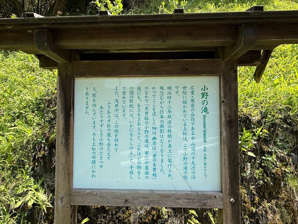 木曽八景の一つとされ、江戸時代には葛飾北斎や安藤広重の浮世絵で「小野ノ瀑布」として描かれています。