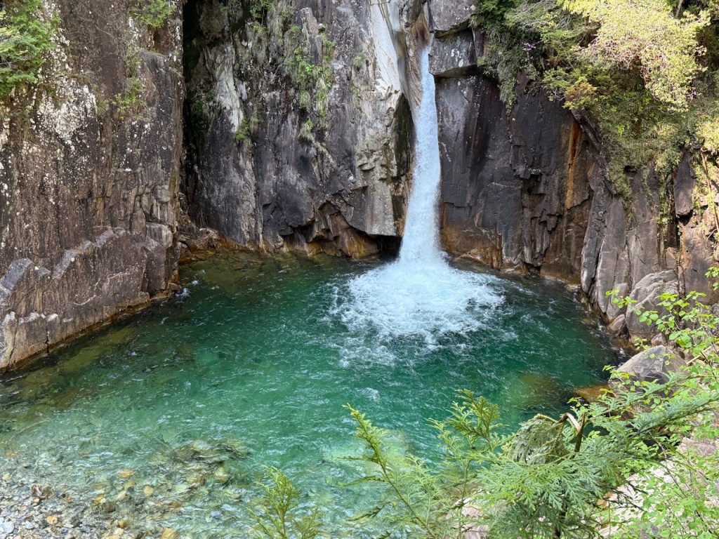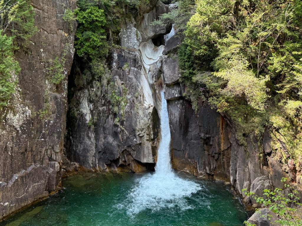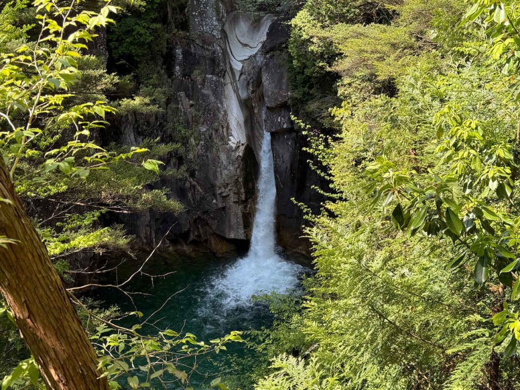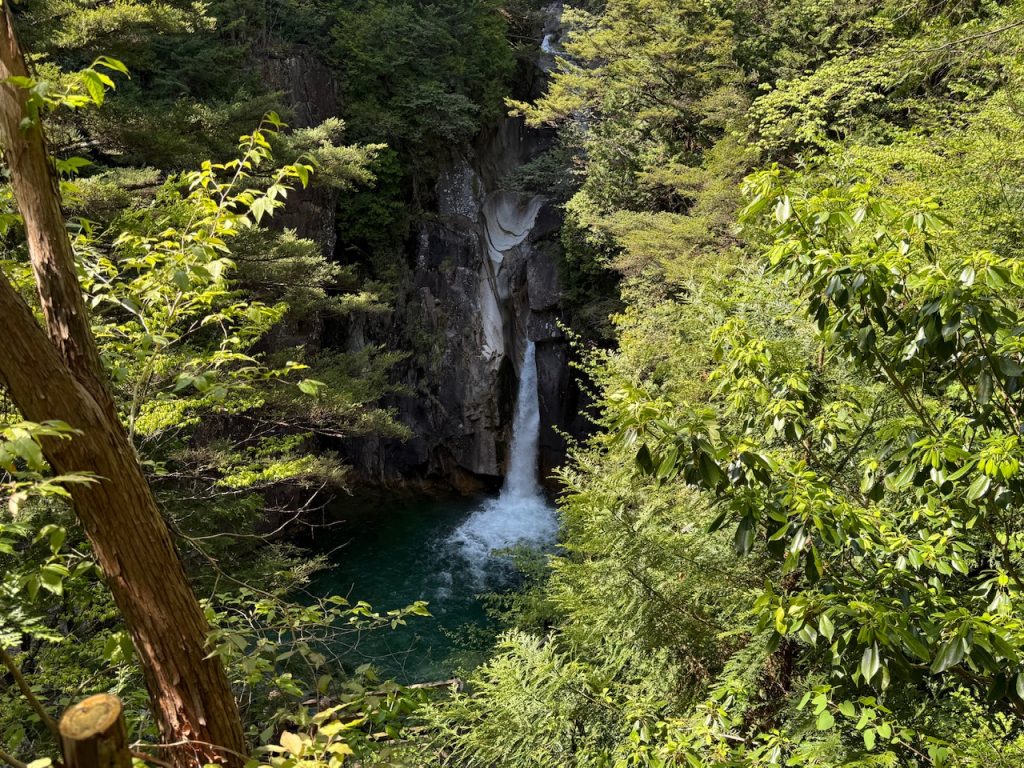 直角に勢いよく流れ落ちる白い飛沫の水とエメラルドグリーンの滝壺が美しいです。
